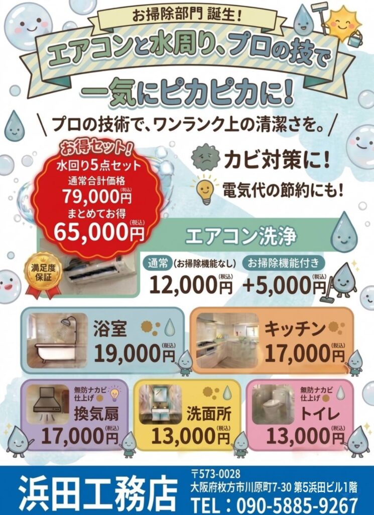 お知らせ 新しいチラシができました 〜エアコンと水周り、プロの技で一気にピカピカに!〜 2026年3月13日 admin_hamada-komuten このたび弊社の新しいチラシができました。 エアコンと水周りのクリーニングも承ります。お得なセット料金もご用意しております。住まいに関することは何でもお気軽にお問い合わせください。